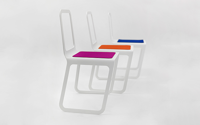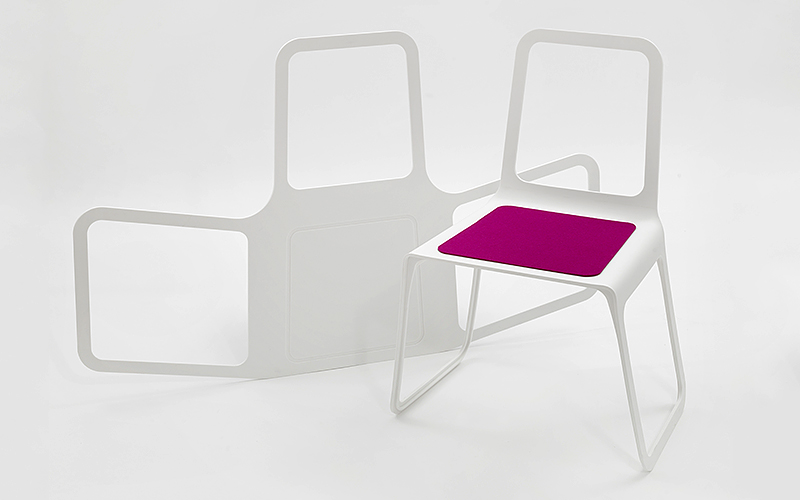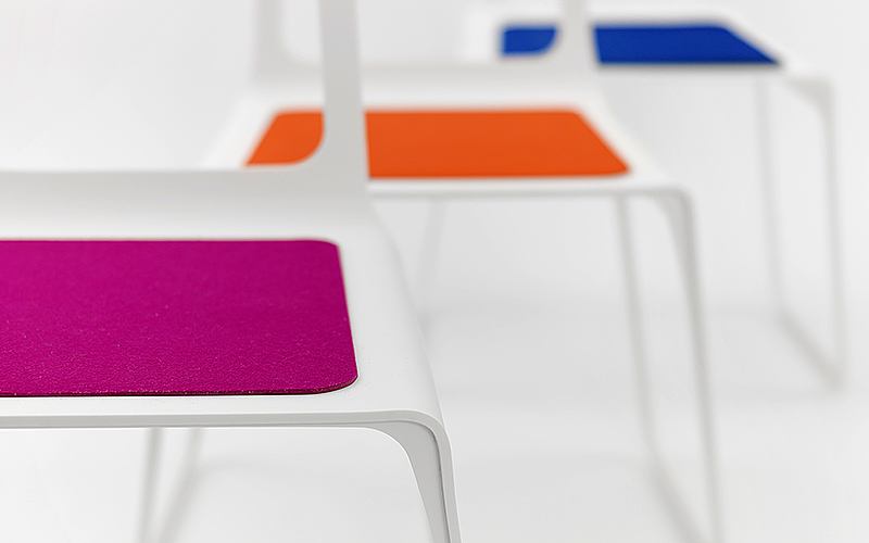 The many different material and color variants for the chair and the seat surface made of felt, offer great scope for individualization; also the option to apply the design and production process for an extended product range (stool, side table, table, bench etc.) all these help to make the Chroma a flexible product for many purposes, to be used both indoors and outdoors. In addition the chair is stackable, it is stable and retains its shape and with a weight of a mere 3 kg it is also easy to handle.