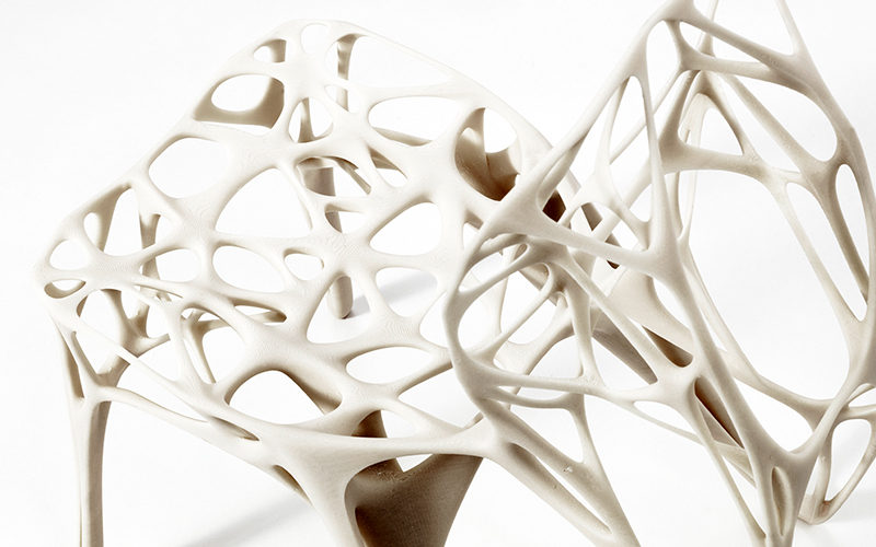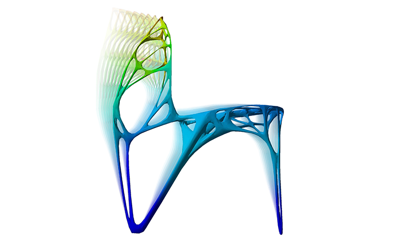 The topology optimization generated an ideal material layout for the given conditions while also reducing local stresses and maintaining structural stiffness for the design. In an iterative process the calculation resulted in a reduction of the necessary material to meet the performance requirements. In a further optimization process the digital 3D-model was reviewed again against the background of usability and human factors, e.g. smoothness of surface, user comfort, contact zones. In order to verify and optimize the structural performance of the chair design and the material concept, the model was analysed using FEM-Software, regarding deformation and stresses. In parallel, various scale models and prototypes were 3D-printed with different technologies and material properties throughout the whole design process. In a final design step before production all findings were integrated into a definitive 3D-model.