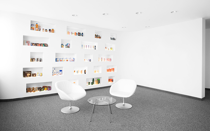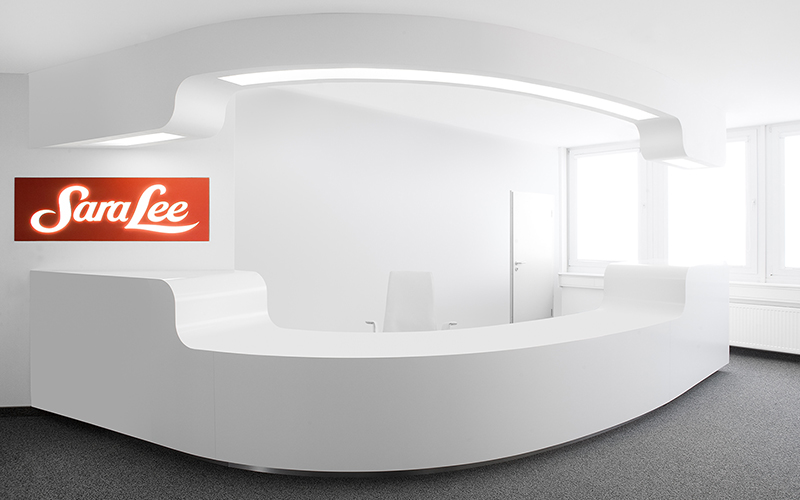 The re-design of the Sara Lee headquarters in Cologne aims to generate a light atmosphere that relates to the products and values of the company. In a first step, the design concept for the reception area was realized as a kick-off for all the office interiors. The daylight-flooded space includes a reception and a waiting area, as well as refreshment facilities. The curved information-counter integrates the registration and the visitor information desk as well as a service counter for drinks and snacks, while the products and brands of the company are showcased in the backlit exhibition wall of the waiting area.